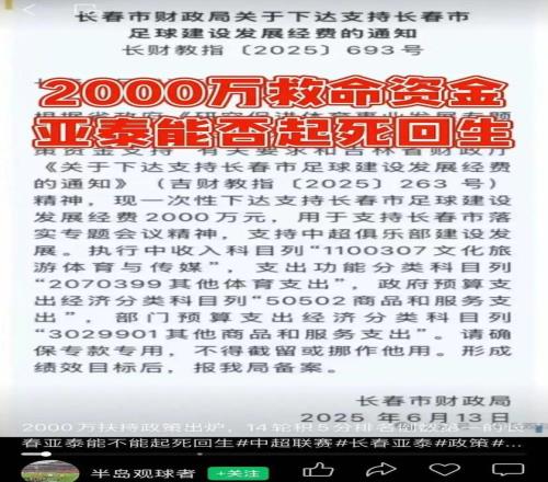 长春市专门下达2000万元财政资金,用于支持长春市足球建设发展,助力长春亚泰起死回生。