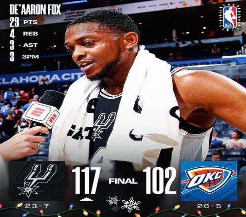 圣诞大战,马刺客场117-102战胜雷霆。