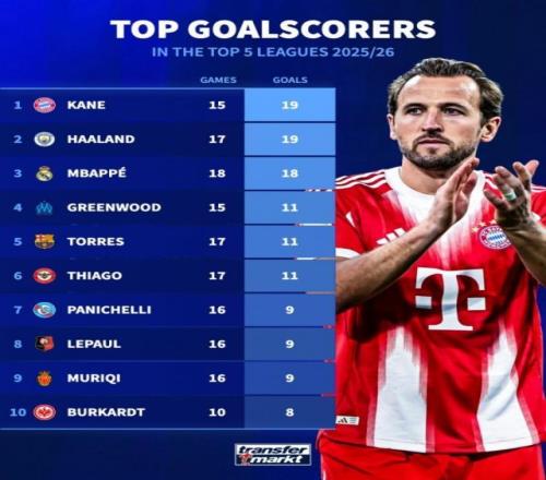 德国转会市场列出了本赛季五大联赛射手榜,凯恩、哈兰德19球居首。本赛季五大联赛射手榜: