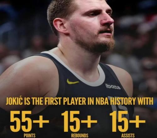 而在本场比赛之前,在上一场面对森林狼的比赛中,约基奇21中15,砍下更疯狂的56分16篮板15助攻。55+15+15,NBA历史第一,个人加时赛独得18分,历史第一。