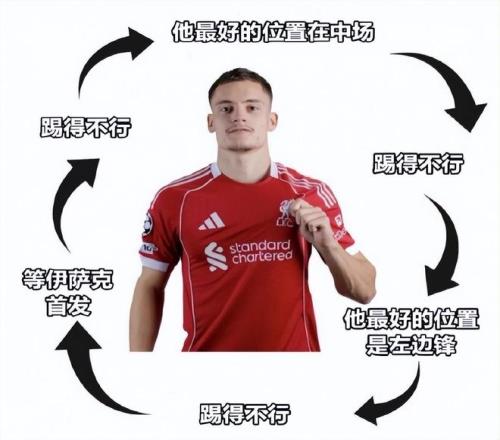 有球迷戏称维尔茨的名字缩写说明了一切(Florian Wirtz缩写是FW),这显然是片面的。维尔茨在利物浦并非完全没有亮点,他的处理球明快,给人一种很有活力的感觉。但恰恰就是之前没有进球也没有助攻,导致大多时候只是看着热闹却没有结果。