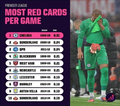 切尔西一度连续4场比赛拿到红牌(有一场是球队主帅马雷斯卡),更是6场收集到5张红宝石卡,因此也被送上了“红军切尔西”的雅号。