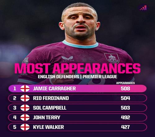 根据Opta Analyst的统计,在伯恩利对阵埃弗顿的比赛中,沃克完成了个人第427次英超出场,超越索斯盖特,成为英超历史上出场次数第五多的英格兰后卫。