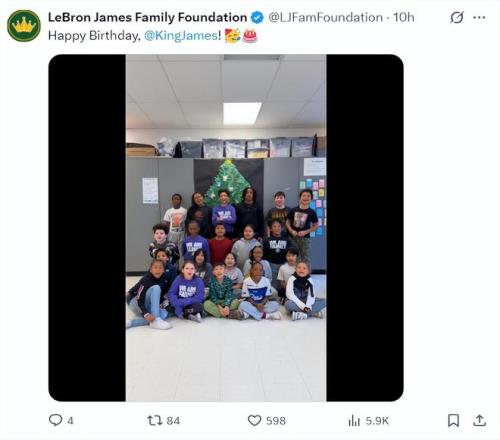 美媒勒布朗家族的小球迷们为勒布朗-詹姆斯也唱了一首生日歌,这个勒布朗家族大多数都是勒布朗基金资助的小朋友(勒布朗自2005年起慈善捐款超过2亿美元)。这些小球迷还纷纷录制了一段祝贺勒布朗41岁生日的演讲小视频。