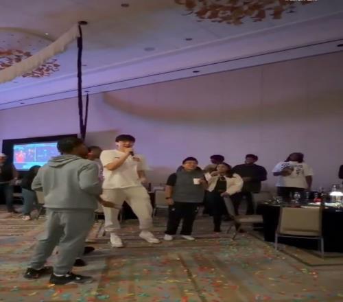 等乐福唱完,助理教练、其他队友们纷纷指向了杨瀚森,起哄着让他再来个中文版的生日歌。