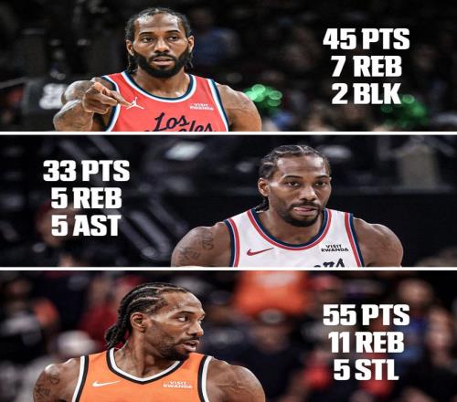 此役后伦纳德又创造了多项纪录:1.一周内伦纳德分别拿到55分、45分是生涯第一高与第二高;