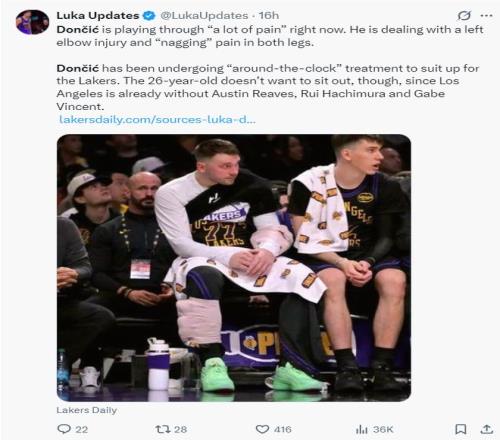 赛前东契奇媒体透露东皇一直都在伤病中,他表示:东契奇目前带着诸多伤病坚持登场,目前东契奇的左肘有伤,双腿也一直隐隐作痛,他每一场比赛后都会进行一些治疗以便能为湖人出战。这位26岁的球星不想缺席比赛,因为他知道湖人已经缺少了文森特、八村垒、里夫斯等多位球员。