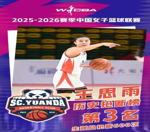 在1月4日晚上的比赛中,四川女篮客场99-76大胜陕西女篮,拿到2连胜。此役,山东姑娘王思雨首发登场,打了22.6分钟,她7投4中,拿到9分4助攻1抢断。正是凭借这1次抢断,让王思雨的个人历史抢断总数来到600次,从而来到了历史抢断榜的第3名!恭喜王思雨了!