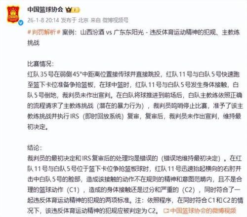 1月8日晚上,中国篮协官方发布通告,正式确认广东与山西一战中裁判存在四次重大误判。然而,篮协承认错了也白搭,漏判了山西队2次违体犯规,结果是不能更改的,广东队只能吃个哑巴亏了。