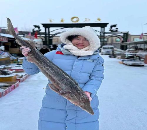 黄菲在抚远东极见识到了当地的特产鲟鳇鱼