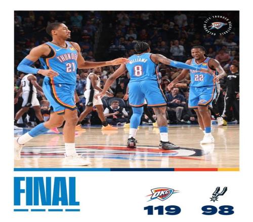 雷霆队,杰伦威廉姆斯15中9高效砍下了20分3助2断、卡鲁索8中5独得13分2板4助,末节连续得分成为取胜功臣。杰林·威廉姆斯10中4得到了11分10板5助2帽,展现了全能的身手。米切尔8中4得到11分6板4助、霍姆格伦4中1得到8分10板3帽,在防守端威慑力十足。以赛亚乔8分2板、华莱士6分1板1助3断、维金斯5分5板4助2帽、肯里奇·威廉姆斯3分2板。