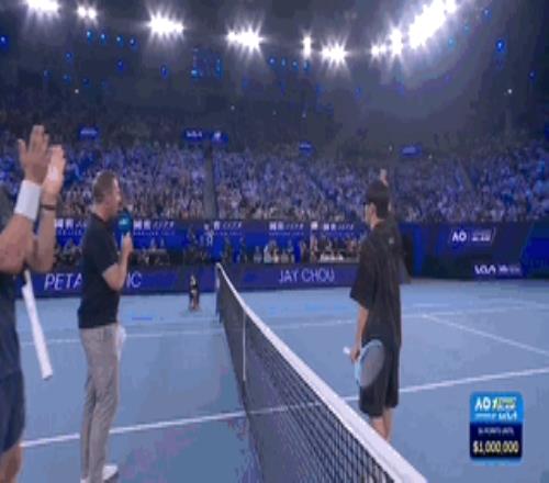 北京时间下午5点12分,周杰伦和他的对手约维奇(维多利亚州业余冠军)一同登场!开场便引来全场球迷的欢呼!