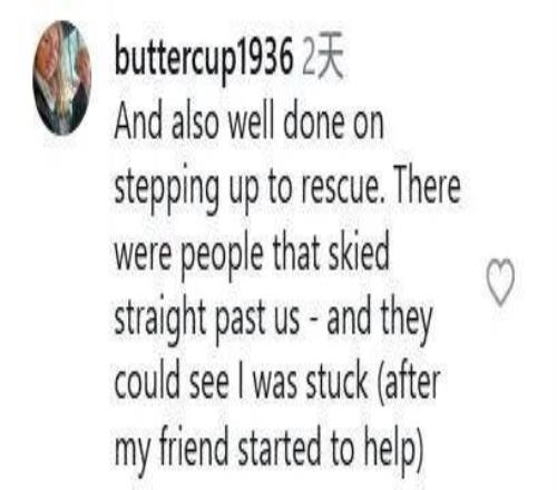 “而且,你能挺身而出救助别人,真的太棒了!当时有些人滑着雪径直从我们身边经过,他们明明看到我被困了(就在我朋友开始救我之后)。”