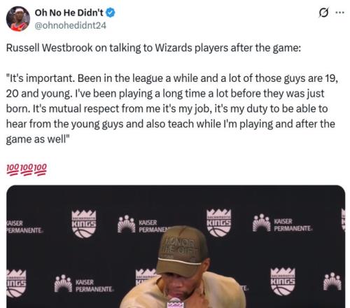 期间威少专门点名国王新秀考德威尔:“我告诉他保持真实的自我非常重要,我很喜欢他通过多种方式影响比赛的做法,这对我们团队非常有利。”