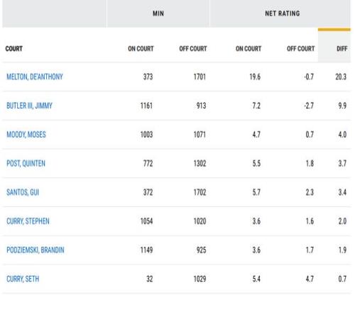 巴特勒本赛季场均20分5.6板4.9助1.4断,命中率51.9%,他本赛季的总正负值+185全队第一,他是否在场,对勇士的净效率影响为+9.9,排名全队第二,第一是梅尔顿,他的净效率影响高达+20.3,不过梅尔顿的出战时间比巴特勒少很多(巴特勒是1161分钟,梅尔顿是373分钟),在出场时间多的球员里,巴特勒净效率影响遥遥领先,远超库里的+2。