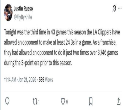 这也是本赛季快船队的最大短板之一,本场让公牛队命中创队史纪录的25记三分,是开季快船队43场以来第三次单场让对手命中至少24记三分,队史此前3746场比赛仅出现2次。