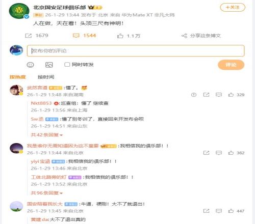 在没有扣分之前,北京IP的球迷各处的嘲笑别的球队是假球队,不曾想自家球队也被扣分了。然而,北京国安不服气,球队更是发文“人在做,天在看,头顶三尺有神明!”