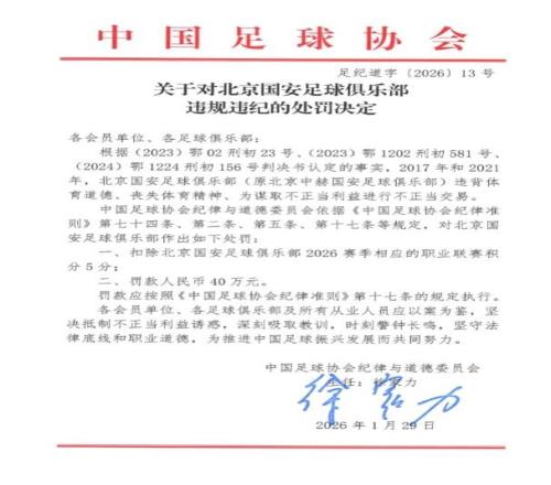 北京时间1月29日,中国足协正式公布了“假赌黑”专项整治行动受处罚的俱乐部名单。新赛季中超共计有9支队将被罚从负分起步,其中就包括申花、海港、国安、泰山等争冠队。