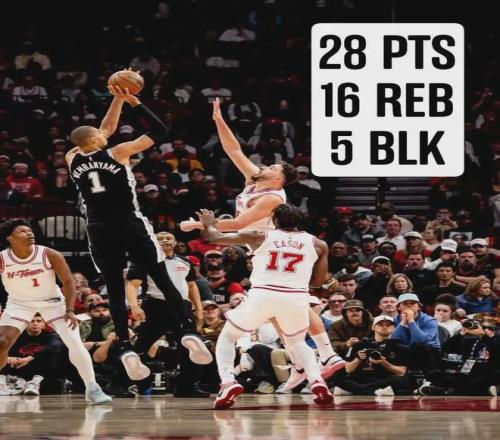 第四节火箭全队投篮23中4,三分2中0,单节仅得13分。文班亚马统治第四节,单节砍下13分9篮板3盖帽。全场比赛,文班15中8砍下28分16篮板3助攻2抢断5盖帽,本赛季第6次单场25+10+5帽,其他NBA球员加起来只有4次。