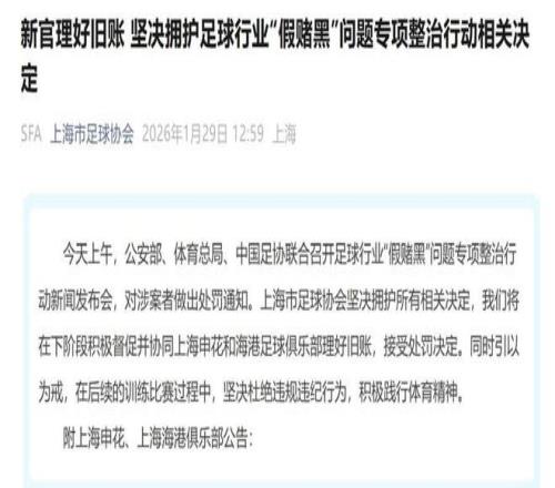 新官理好旧账,这是作为上海职业足球行业部门的上海市足协的官方态度。上海市足协有关人士表示,上海市足球协会坚决拥护所有相关决定,我们将在下阶段积极督促并协同上海申花和海港足球俱乐部理好旧账,接受处罚决定。同时引以为戒,在后续的训练比赛过程中,坚决杜绝违规违纪行为,积极践行体育精神。
