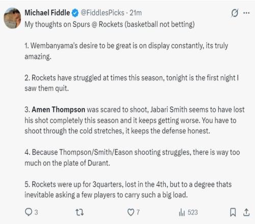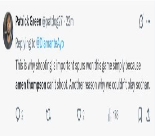 刺蜜:这就是为什么投篮能力如此重要,因为阿门无法投篮所以马刺赢得了比赛,此外我们不让不会投篮的索汉登场也是赢球原因之一。