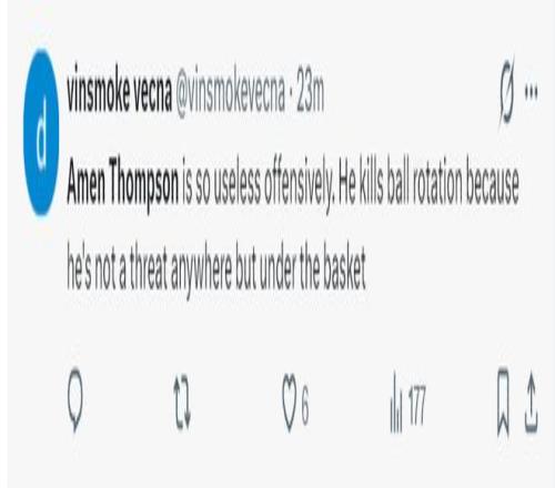 火蜜:阿门-汤普森在进攻方面太没用了。他完全破坏了球的运转节奏,因为他在球场上的任何位置都不具备威胁性,只有在篮下才有威胁。