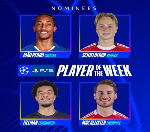 欧冠联赛阶段第8轮比赛全部战罢,欧冠官方公布了本周最佳球员候选名单,分别是若昂-佩德罗、麦卡利斯特、谢尔德鲁普和马里克-蒂尔曼。欧冠官方本周最佳球员候选:若昂-佩德罗 梅