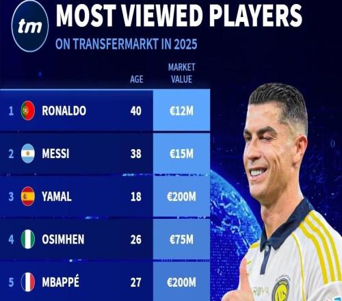 德转2025年度球员浏览量排名:C罗第1,梅西第2,亚马尔第3