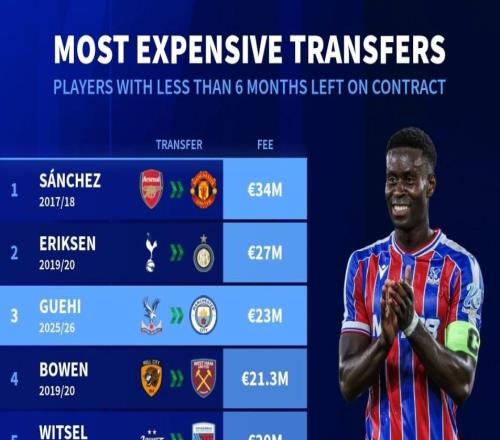 北京时间1月20日,在曼城官宣了格伊的交易之后,德转列出了世界足坛历史合同剩余不到半年的球员转会身价榜,2018年1月从阿森纳转投曼联的桑切斯是3400万欧元排名第一,格伊则以2300