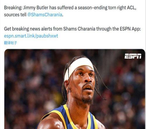 北京时间2026年1月20日下午,ESPN消息,据NBA著名记者Shams报道,勇士大将巴特勒遭遇右膝前十字韧带撕裂,赛季报销。巴特勒是在今日勇士vs热火的比赛中受伤的,在比赛进行到第三节时,