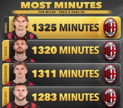 米兰圈Score90统计了米兰球员本赛季意甲出场时间,并列出榜单,40岁莫德里奇1325分钟居首,他仅有25分钟未在场上。